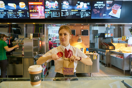 MOSCOW, RUSSIA - CIRCA MAY, 2018: worker at McDonald's. McDonald's is an American hamburger and fast food restaurant chain.