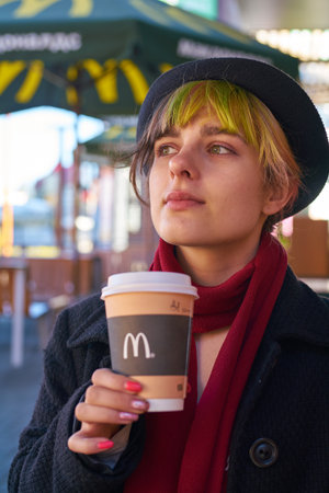 KALININGRAD, RUSSIA - CIRCA APRIL, 2018: young woman with coffee from McDonald's in Kaliningrad.