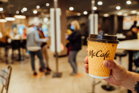 Kiev, Ukraine, October 17, 2021, McDonalds takeaway coffee in a mans hand at background of people ordering fast food remotely at big screen at McDonalds restaurant.