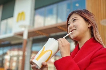 KALININGRAD, RUSSIA - CIRCA SEPTEMBER, 2018: young woman drinks Coca-Cola in the background of the McDonald's restaurant.