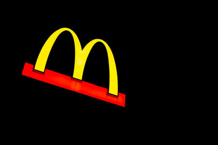 McDonalds restauraunt sign on the black background. McDonalds sell fast food such as hamburgers, french fries and drinks. A famous fast food restaurant in the world.
