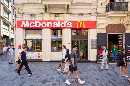 Busy urban street scene with mcdonalds in historic european city. August 11, 2025, Istanbul Turkey.