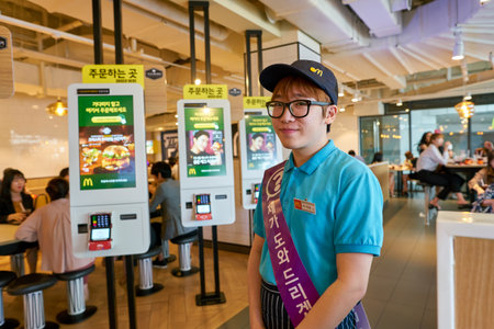 SEOUL, SOUTH KOREA - CIRCA MAY, 2017: indoor portrait of worker at McDonald's restaurant. McDonald's is an American hamburger and fast food restaurant chain.