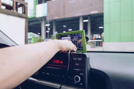 Close up and a man use cable Plug to charge mobile phone in the car : connecting data car play, music,Navigation system and charging mobile in process
