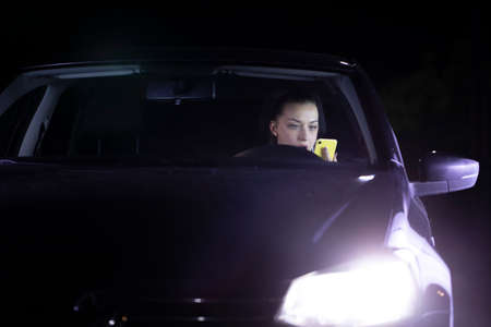 Shocked scared girl sitting in car on night road and looking in mobile phone navigator showed wrong route. Young inexperienced driver lost on road. People emotions, driving, reading message smartphone