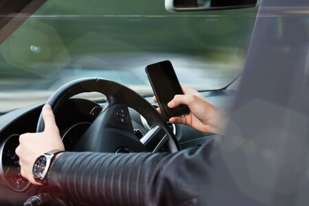 young man holding a smartphone while driving. dangerous travel situation with distraction from street