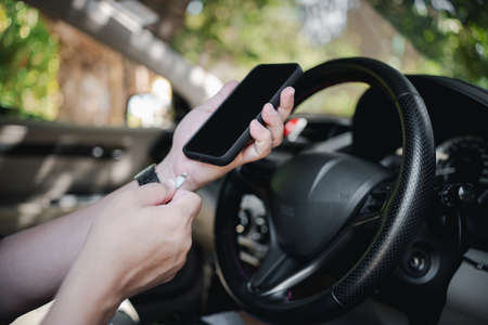 Woman hand on the steering wheel of a car. Smartwatch on businesswoman hand. Cropped. Lifestyle, driving, transport concept