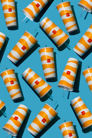 Yellow glass of McDonalds. Paper cup with lid. Takeaway drink. McDonalds logo. McCafe cup shadow top view pattern. Orange juice Fanta drink Fastfood blue background Ukraine, Kyiv - October 6, 2023