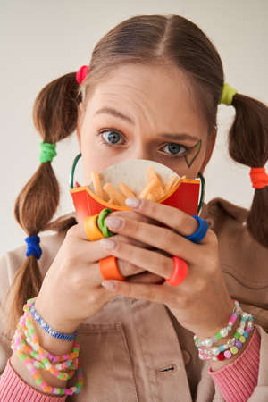 Teenage girl wearing vivid clothes closed her face behind the pocket with fried potato