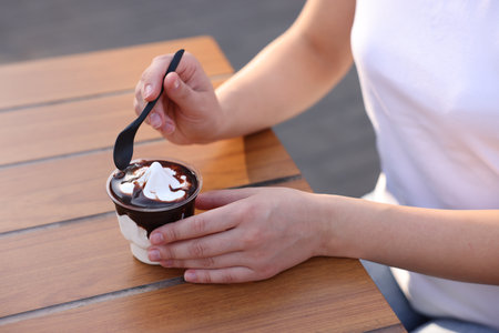 Lviv, Ukraine - September 26, 2023: Woman with McDonald's ice cream at wooden table outdoors, closeup