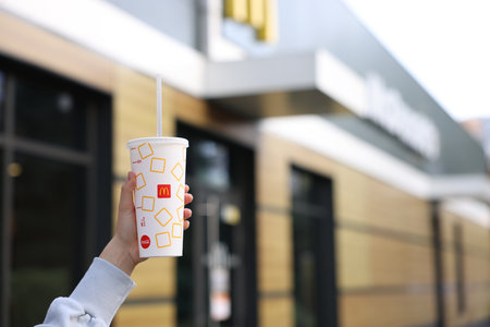 Lviv, Ukraine - September 26, 2023: Woman with McDonald's drink outdoors, closeup. Space for text