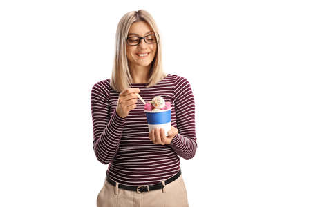 Close up female hands holding spoon and plastic glass with delicious dessert with blueberries and custard
