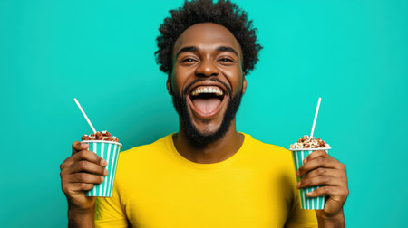 A cheerful young man with curly hair enjoys two cups of popcorn, beaming with happiness in front of a bright teal backdrop at a lively daytime celebration.