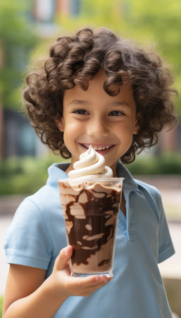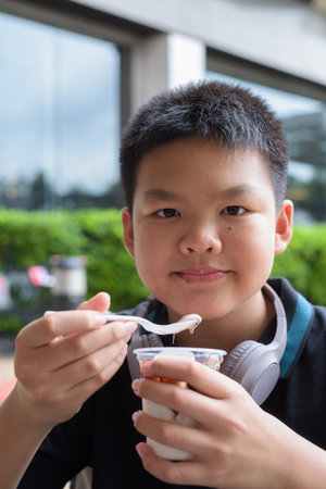 Thai boy eating vanilla soft serve ice cream with chocolate syrup outdoors