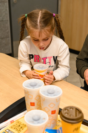 Ivano-Frankivsk, Ukraine, June 7, 2023: a small and cute girl is drinking Coca-Cola in McDonalds.