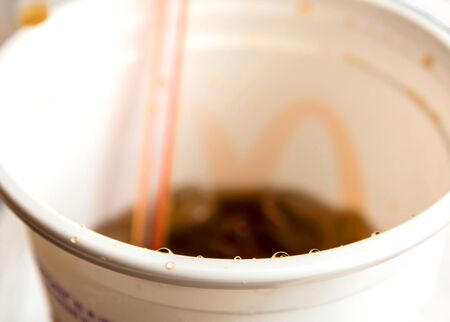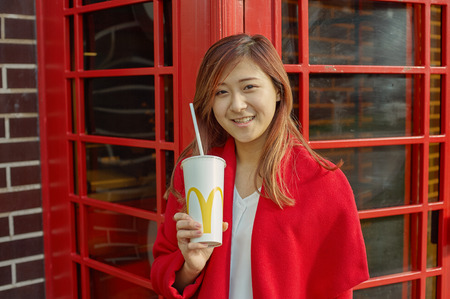 SAINT-PETERSBURG, RUSSIA - CIRCA JULY, 2014: Pretty woman drink soda from paper glass in McDonald`s restaurants. The McDonald's Corporation is the world's largest chain of hamburger fast food restaurants.