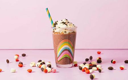 cold lollipop milkshake drink with whip cream and colorful sugar balls