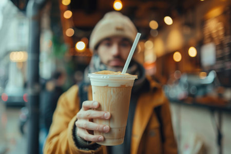 Kiev, Ukraine, October 17, 2021, McDonalds takeaway coffee in a mans hand at background of people ordering fast food remotely at big screen at McDonalds restaurant.
