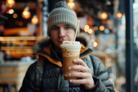 Lviv, Ukraine - June 14, 2020 : man having oatmeal for breakfast at McDonald's restaurant. One of the breakfast meal choice at McDonald's, Weekday Breakfast Specials
