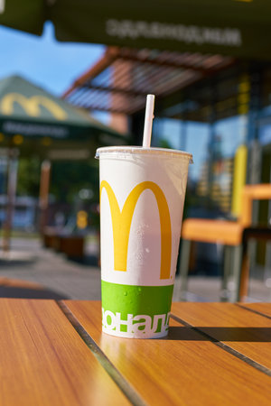 Ukraine, Kyiv - June 4, 2021: Yellow glass of coffee from McDonald's. Paper cup of coffee from McCafe on the table with copy space against blurred foliage. Menu in McDonalds restaurant.