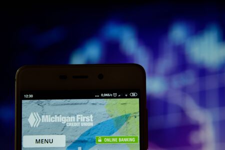 Ivano-Frankivsk, Ukraine - May 16, 2019: Michigan First Credit Union logo is seen on an smartphone over over stock chart. Michigan First Credit Union logo is displayed on the screen of a mobile device.