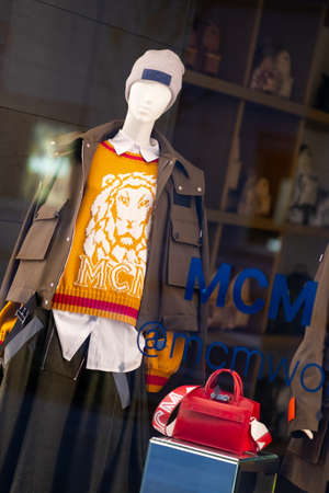 TOKYO, JAPAN - NOVEMBER 06, 2019: Display of MCM store in Ginza, Tokyo, Japan. MCM Worldwide is a leather luxury goods brand.