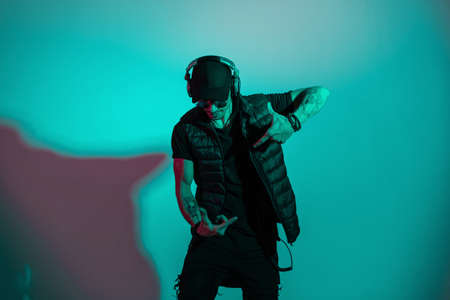 Stylish dancer man with sunglasses and cap in fashionable black clothes dancing and listening to music on headphones in the studio with creative colored light