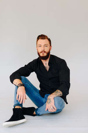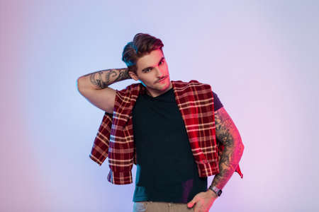 Hipster fashion handsome guy with hairstyle and tattoos on arms in stylish vintage clothes with plaid shirt in studio with creative colorful lights
