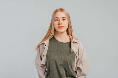 Portrait of happy cheerful blonde girl looking at camera. Lovely Stylish girl wearing casual clothes posing isolated on light background