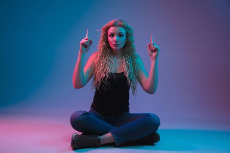 Caucasian young womans portrait on gradient background in neon light. Beautiful female model with unusual look. Concept of human emotions, facial expression, sales, ad. Sitting and pointing up.