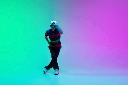 Beautiful sportive boy dancing hip-hop in stylish clothes on colorful gradient background at dance hall in neon light.