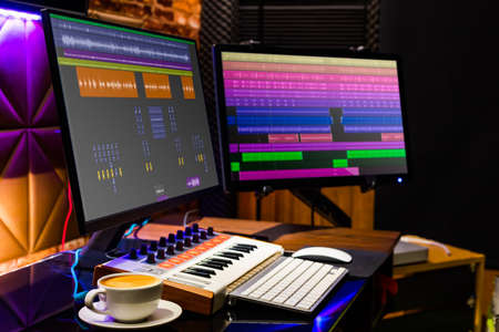 cup of coffee on desk with dual display monitor and midi keyboard for music production