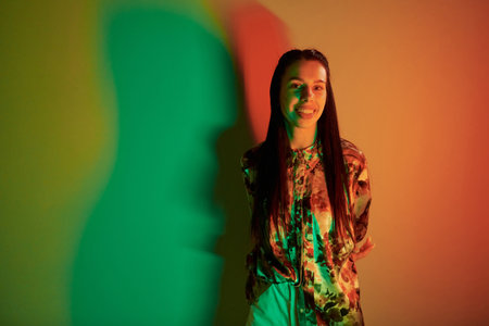 Posing for camera. Fashionable young woman standing in the studio with neon light
