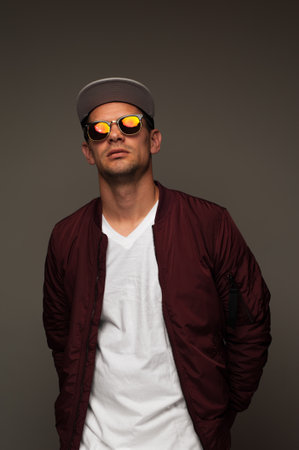 Young hipster in cap, jacket and spectacles eyeglasses.