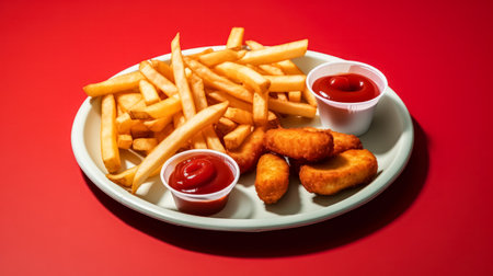 Crispy temptation, Irresistible French fries, golden nuggets, and ketchup unite on a vibrant background, embodying the essence of fast food joy.