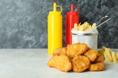 Crispy chicken nuggets, meat takeaway meal with salt and spices. Chicken nuggets, fast food, junk food