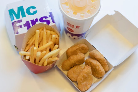 Happy Meal menu at McDonald's restaurant. Happy Meal Kids Next to Cheeseburger, Drink and Chicken McNuggets. Time for a snack, lunch, breakfast. Children's menu. , Salzburg, Austria - October 2020.