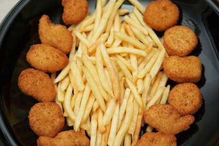 Tasty Fastfood: Chicken Nuggets and French Fries on a plate on a black background, side view. Close-up.
