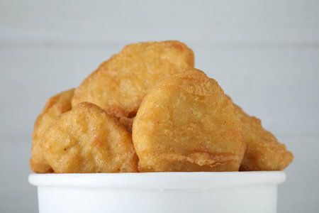 Bucket with tasty chicken nuggets on white wooden background, closeup