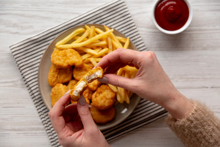 Chicken nuggets. Fast food. Chicken nuggets with ketchup. Holding chicken nuggets. Man eating chicken nuggets. Unhealthy lifestyle, calories, obesity, American food.
