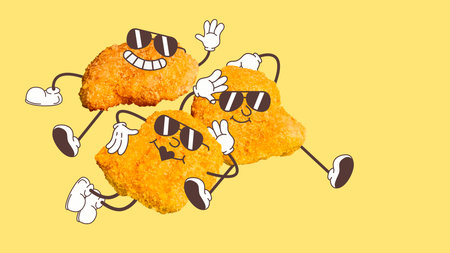 Playful cartoon chicken nuggets with sunglasses on yellow background. Fast food advertisement