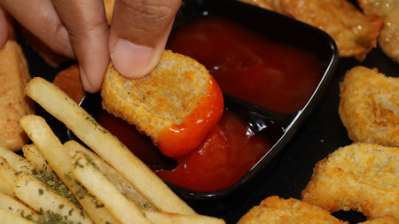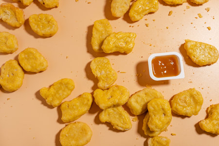 Chicken nugget with sauce, crispy nutritious fast food. Chicken nugget as food background for your design