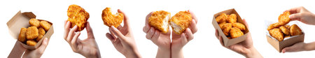 Set of hand holding Golden brown breaded battered deep-fried baked Chicken nuggets, takeaway paper box carton, stack broken bitten pieces, isolated cutout. Many