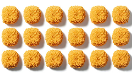 A batch of crispy breaded and fried chicken nuggets arranged in rows on a white background. Clear details and vibrant colors enhance visual appeal. resolution use. marketing