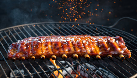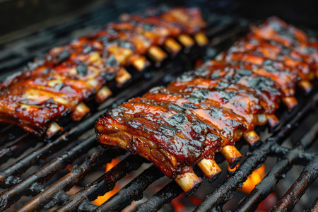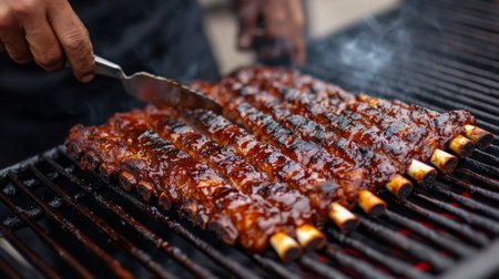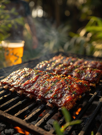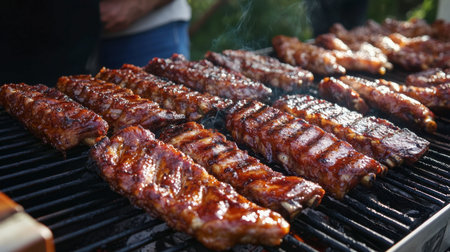 Savory barbecue ribs are sizzling on the grill, showcasing a rich glaze. Perfect for summer gatherings, these mouth-watering treats inspire outdoor dining.