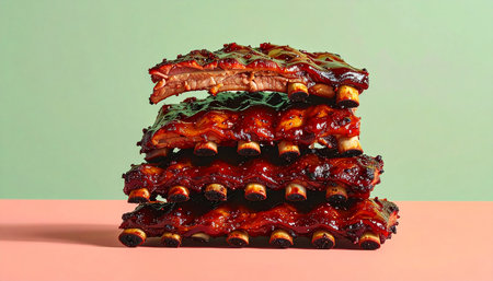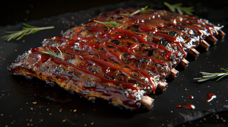 A mouthwatering view of barbecue ribs coated in a rich, sticky sauce, perfect for food enthusiasts and culinary presentations. Ideal for enticing imagery.