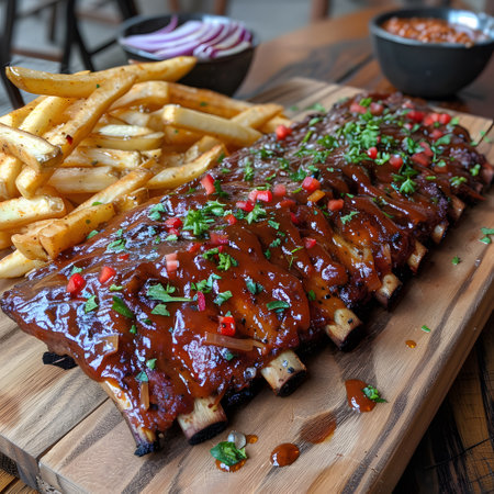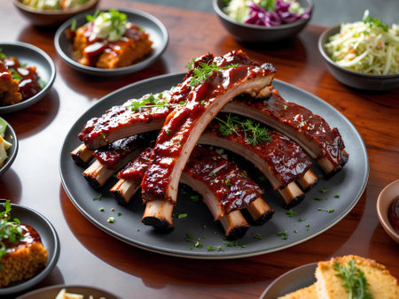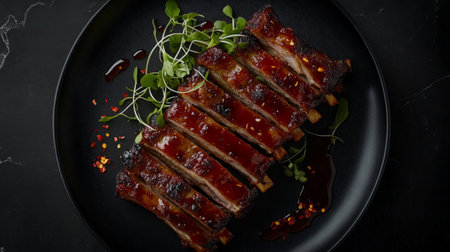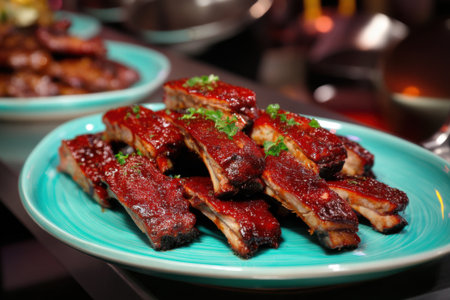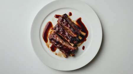 This image showcases succulent barbecue ribs drenched in a rich sauce, beautifully plated and perfect for any food lover