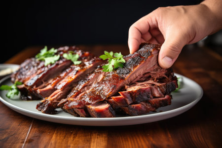 hand adjusting garnish on plate of applewood smoked pork ribs, created with generative ai