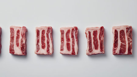 A visually appealing arrangement of fresh raw beef short ribs on a clean white surface, perfect for culinary showcases, grilling, or hearty meals.