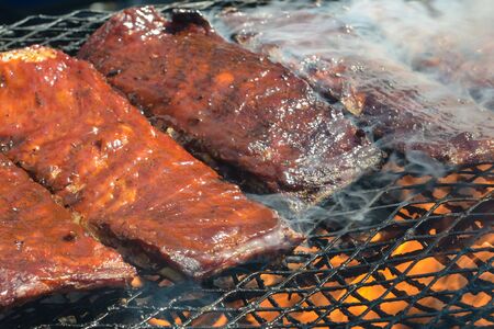 Mouthwatering Rack of Ribs on Round Grill. Glazed Barbecue Meat Over Hot Coals. Event cooking